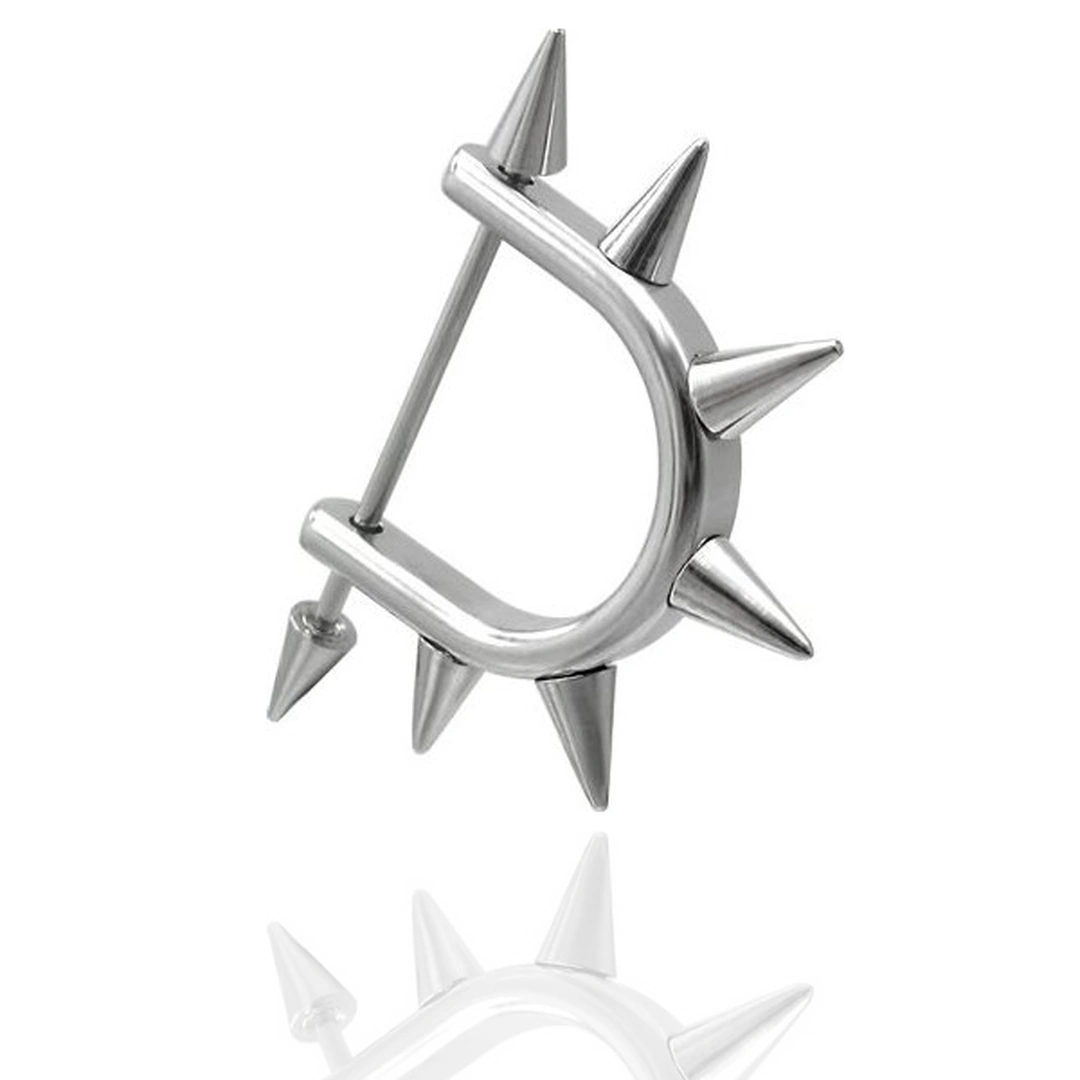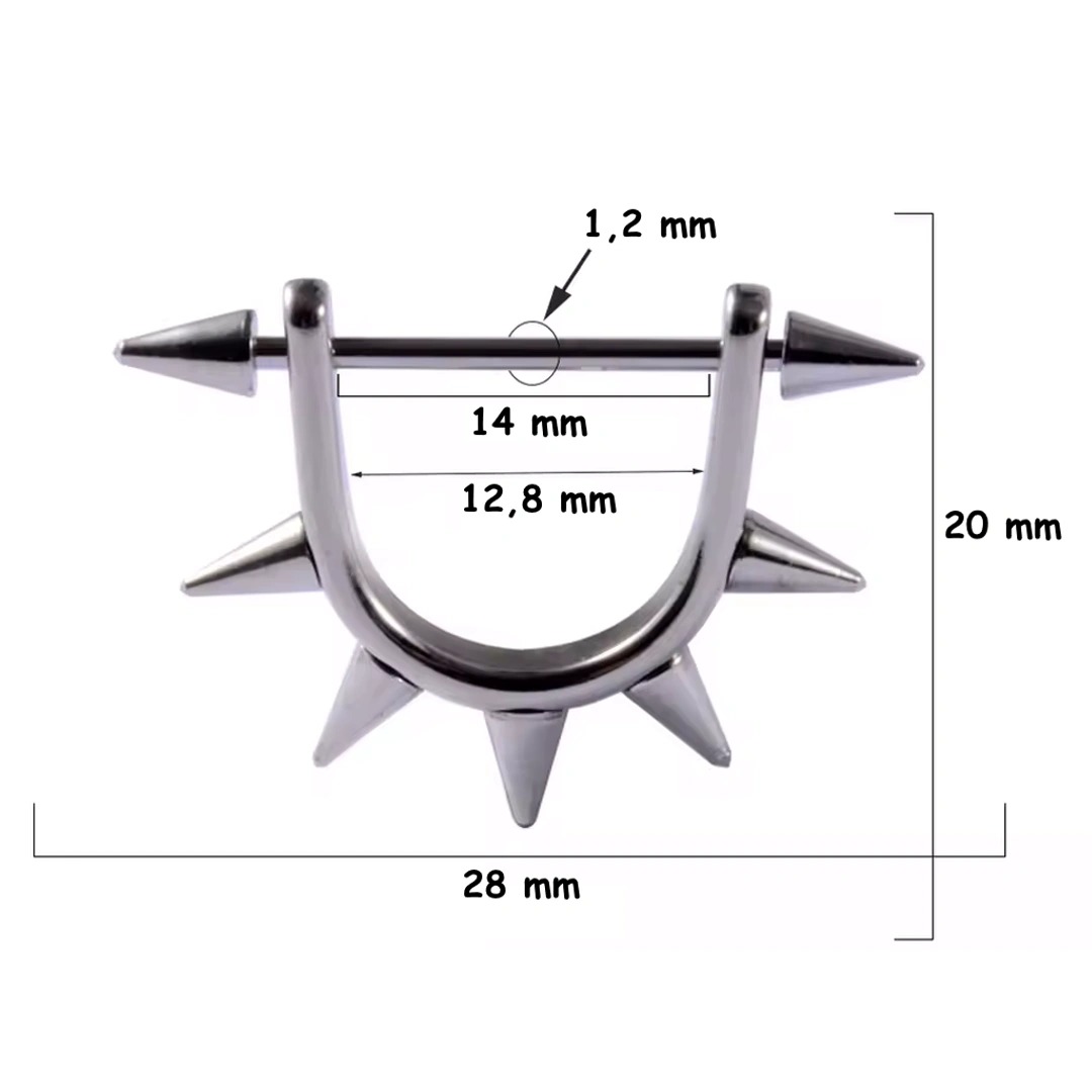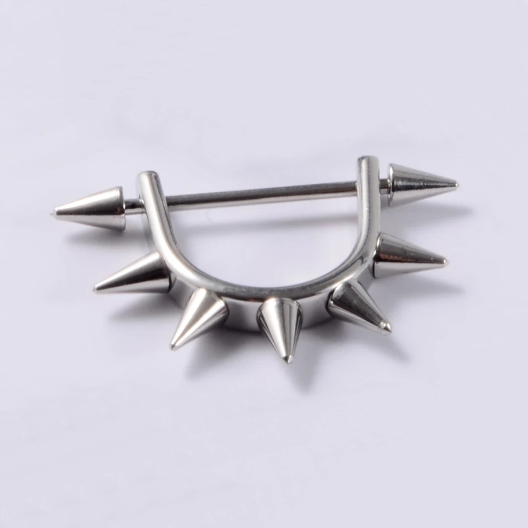 Un bijou percutant, où l’acier chirurgical 316L se courbe en un U hérissé de pointes, pour souligner le téton avec force et précision.