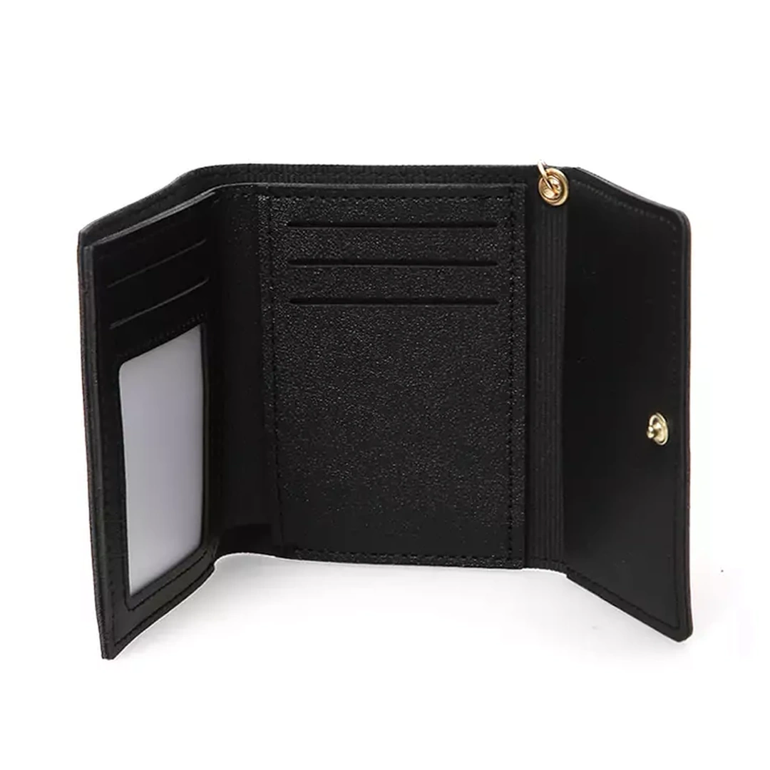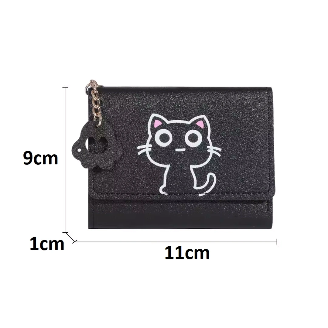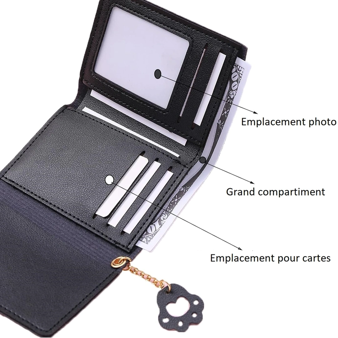 Un portefeuille noir en cuir PU, où l’élégance rencontre la malice : une illustration de chat délicatement accompagnée d’une petite chaîne ornée d’une patte. Pratique et raffiné, il cache un emplacement pour photo, un grand compartiment et 4 emplacements pour cartes.