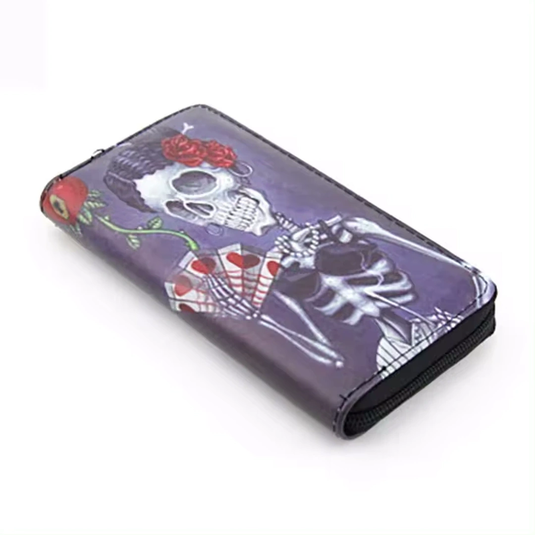 Portefeuille grand format à teinte violette en cuir PU, orné de l’illustration d’une femme squelette coquette. Pratique et raffiné, il offre plusieurs compartiments et une fermeture éclair pour la petite monnaie.