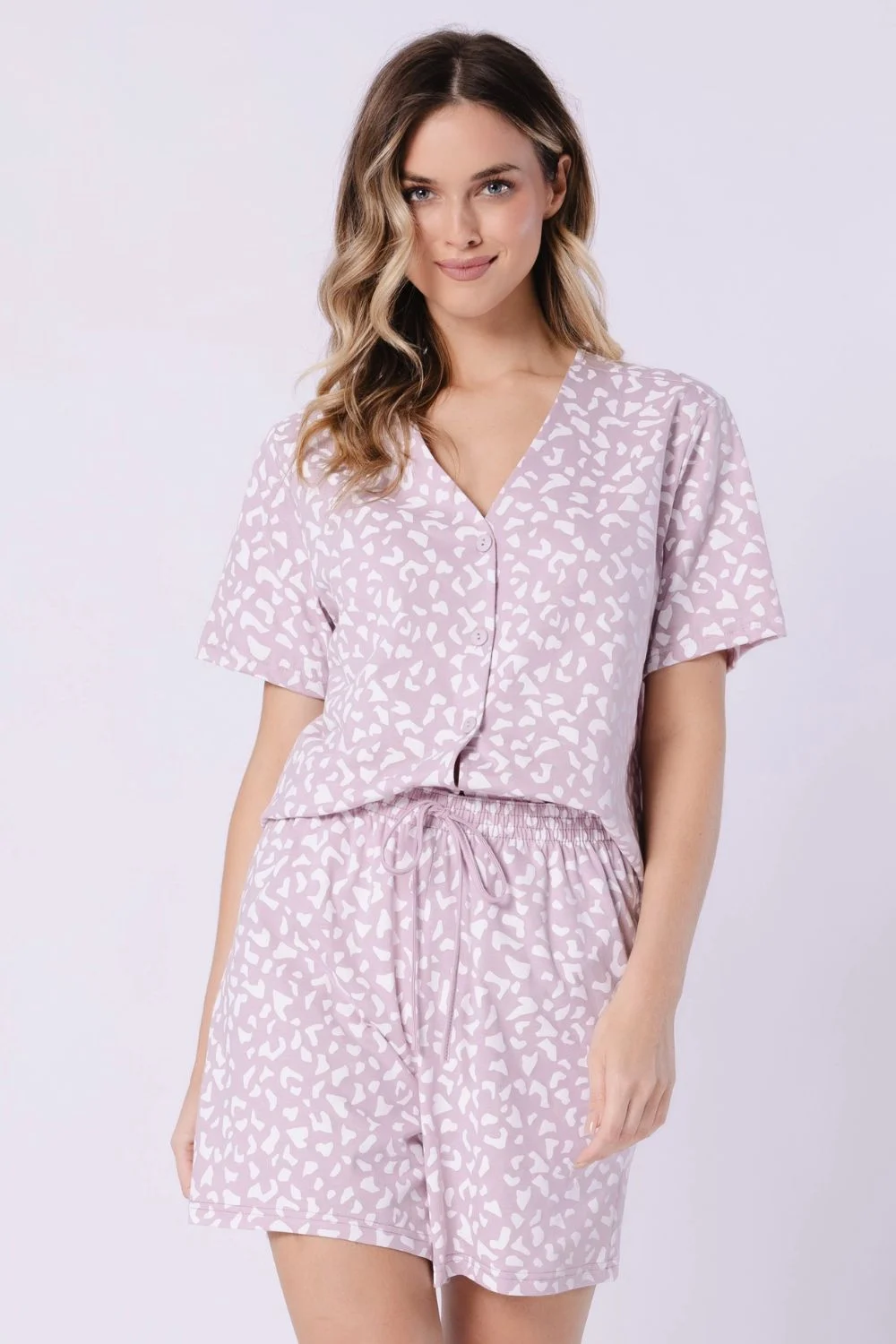 Pyjama féminine élégante et confortable, idéale pour les nuits chaudes et la détente à la maison. Le t-shirt à manches courtes, boutonné, offre légèreté et un look classique et élégant. La coupe ample et confortable garantit une liberté de mouvement totale. Le short assorti avec motif est fabriqué dans un tissu doux et respirant, avec une taille élastique et des cordons pratiques pour un ajustement parfait. Le tout est emballé dans un sac en plastique, ce qui facilite le rangement ou le transport.
