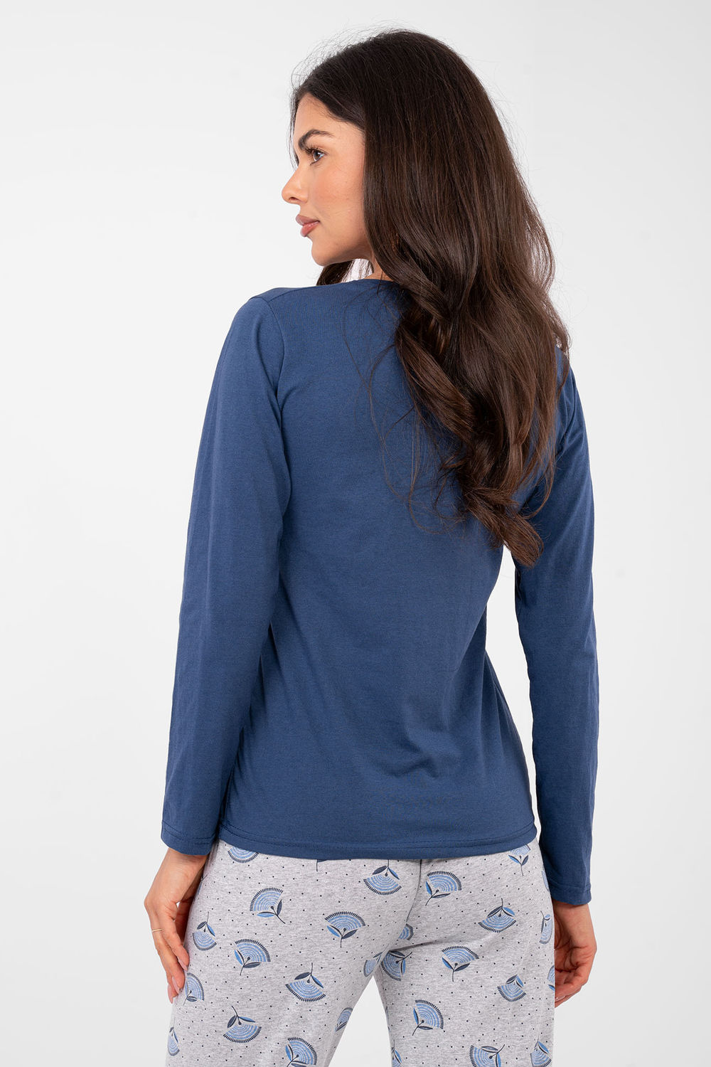 Pyjama pour femme confortable composée d’un haut et d’un pantalon, conçue pour le confort et un usage quotidien. Fabriqué en coton de haute qualité, doux, respirant et doux pour la peau. Tant le pantalon que le devant du haut sont ornés d’une impression subtile, donnant à l’ensemble un caractère cohérent et féminin. Le haut à manches longues et col rond classique assure un grand confort. Le pantalon long avec des jambes droites et une taille haute garantit une liberté de mouvement et un ajustement parfait. Modèle sans poches, de forme légère et esthétique.