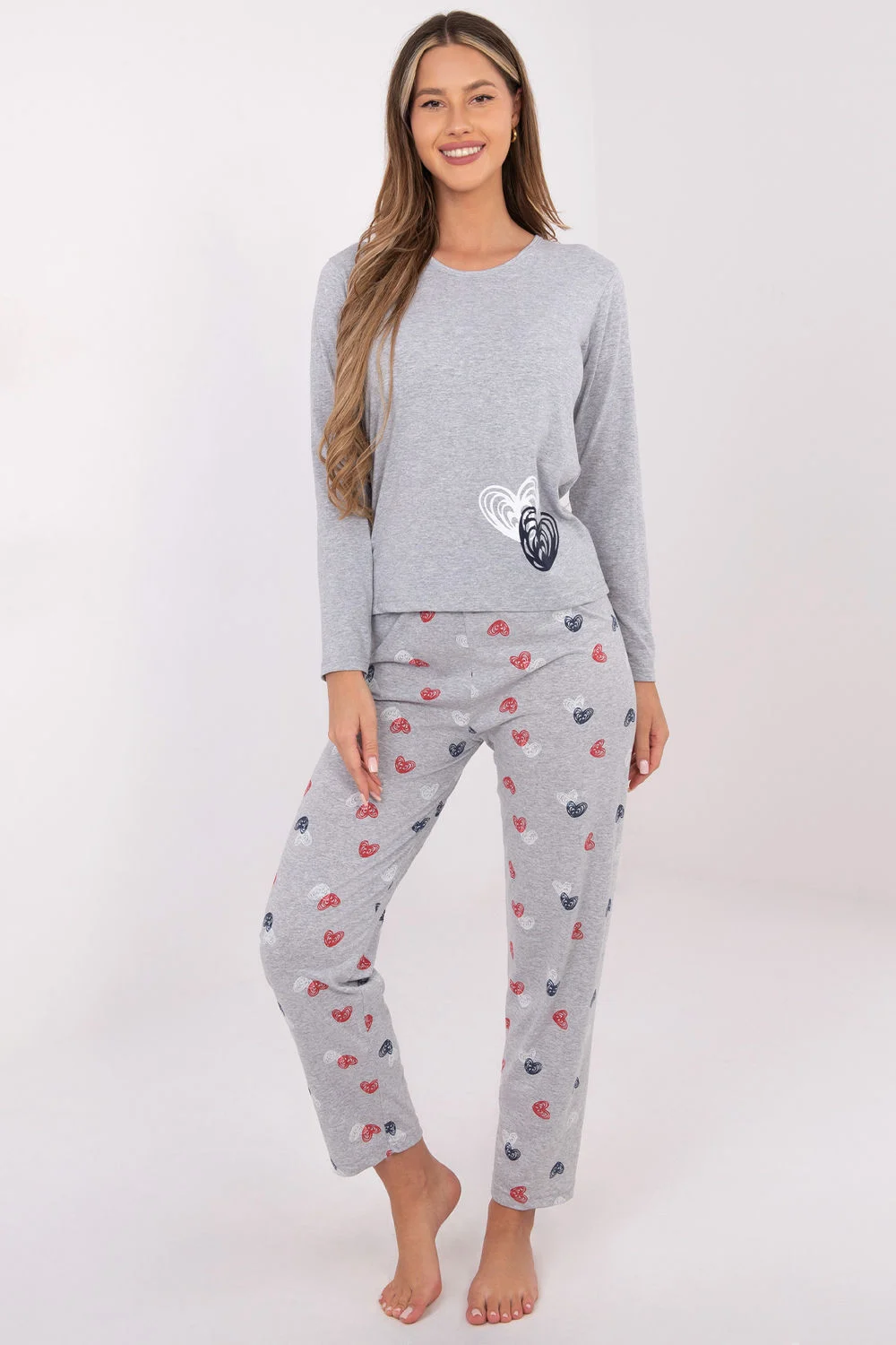 Confortable, pyjama pour femme en deux parties fabriquée en coton doux et respirant, idéale pour des nuits paisibles et des soirées relaxantes. L’ensemble comprend un haut à manches longues, orné de jolis cœurs imprimés en bas à l’avant, et un pantalon long avec un motif de cœurs répétés, créant un ensemble cohérent et féminin. Le haut a un col rond qui assure un confort de port. L’ensemble n’a pas de fermeture, il est facile à enfiler et très confortable. Élégant, doux et féminin, parfait comme cadeau ou comme pyjama préféré au quotidien.