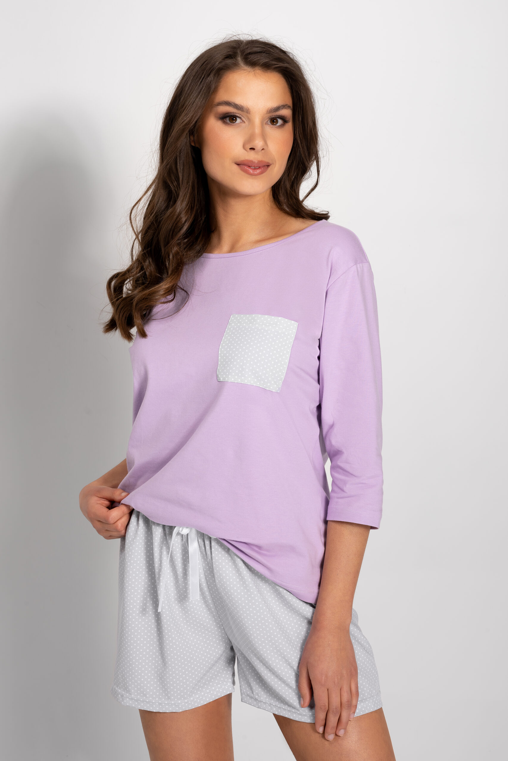 Pyjamas pour dames composés d’un chemisier et d’un short. Blouse à manches 3/4, avec une poche sur le devant. Short à taille élastique, avec nœud décoratif.