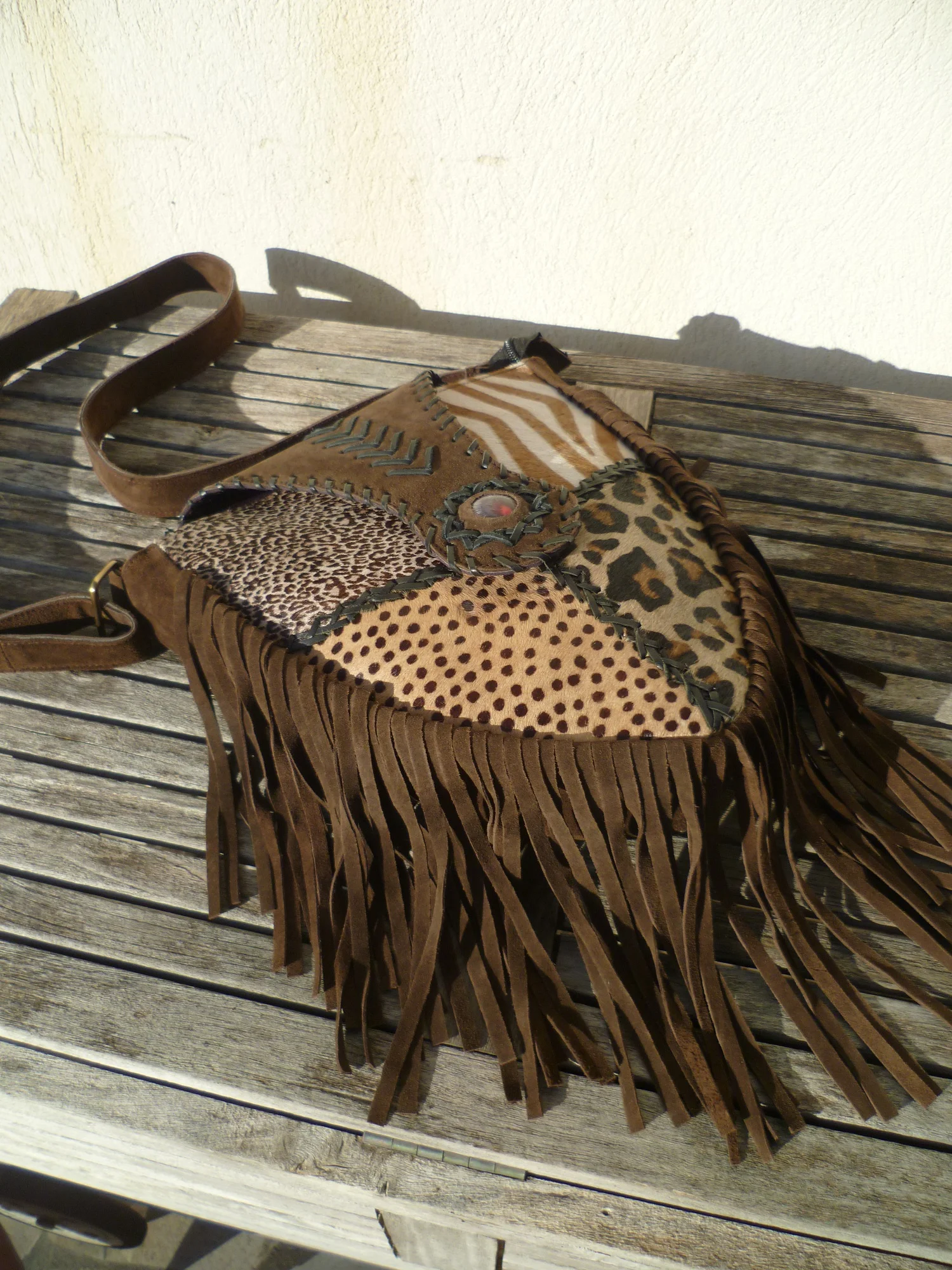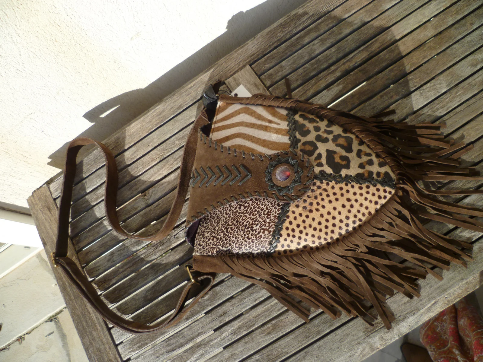 Vous adorerez ses longues franges en daim véritable mais surtout son style unique! Forme allongée superbement originale. Adoptez le style ethnique en toute saison! Portez ce superbe sac en bandoulière façon besace, ou à l’épaule. Coloris unique choco et patchwork de motifs. Poche intérieure. Se ferme par un zip interieur ainsi qu’un rabat à fermoir aimanté. Un joli look branché, amérindien, idéalement pour vos tenues de tous les jours, en toute saison!