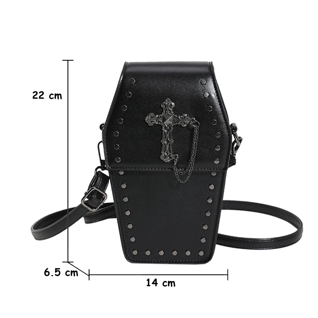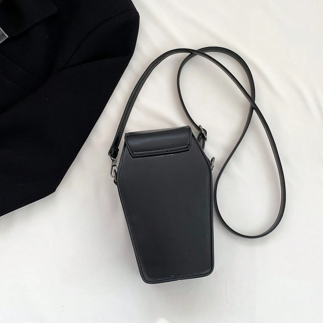 Inspiré des symboles forts de l’esthétique gothique, ce petit sac à bandoulière en cuir PU s’impose par sa silhouette unique en forme de cercueil.