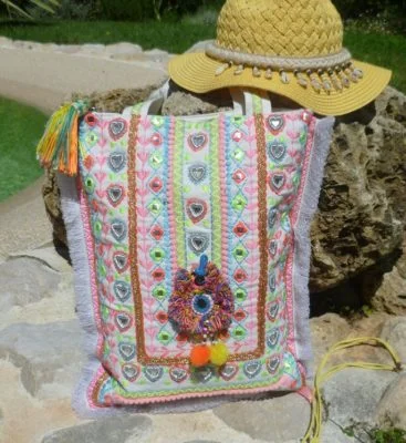Superbe et original le sac gipsy fluo 100%boho en toile blanche. Imprimé ethnique, franges ultra fines, bijoux et strass de couleurs fluo, et petits pompons aux couleurs rose fluo dans un imprimé ethnique. Original et ultra coloré, facile à porter pour l’été. Entièrement doublé rose fushia flashy. Zip de fermeture et double poche intérieure. Bandoulière blanche et broderies vert et rose fluo, en coton doublé. Idéal pour vos tenues branchées, jean ou robe. Un sac au look hippie bohème, pour la plage, ou pour une ballade en ville. il fera l’affaire! Craquez pour son originalité!