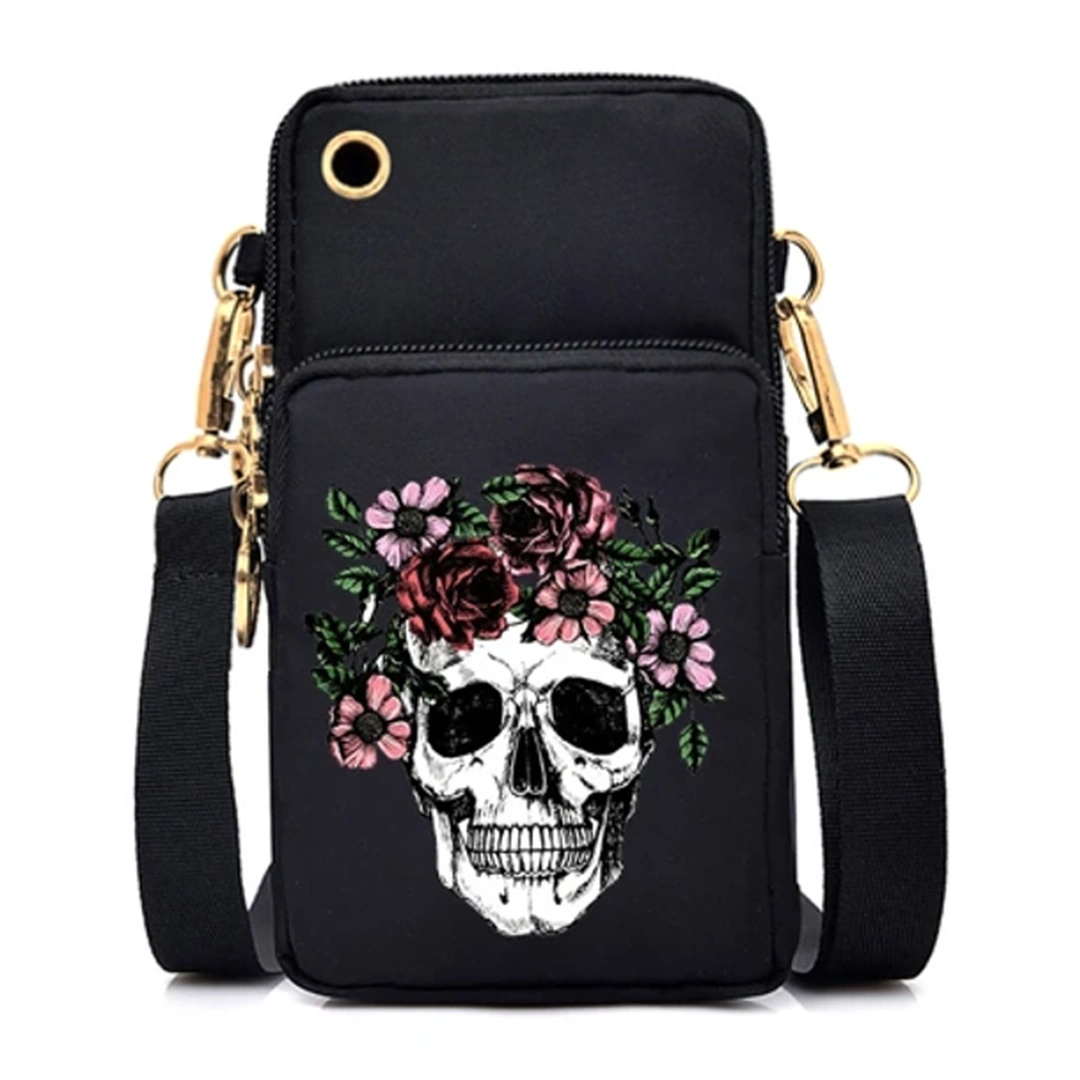 Un hommage à la beauté éphémère. Un crâne orné de fleurs, pour une élégance gothique pleine de grâce et de contraste. Cette sacoche en toile offre une bandoulière amovible et un bracelet élastique pour un port au bras sans encombrement.