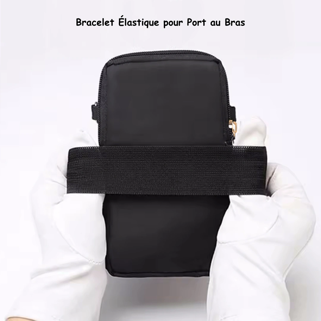 Confectionnée en coton et polyester, cette sacoche allie légèreté et résistance. Choisissez de la porter à l’épaule grâce à sa bandoulière détachable, ou au bras grâce à son bracelet élastique discret qui vous offre une liberté de mouvement totale.