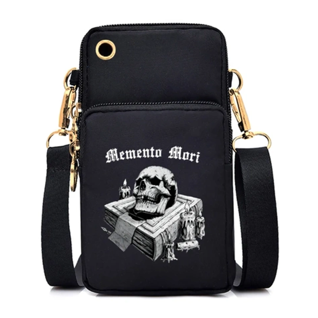 Emportez l’essentiel avec style. Une sacoche noire au design Memento Mori, avec bandoulière amovible et bracelet élastique pour un port au bras qui libère votre épaule et vos gestes.