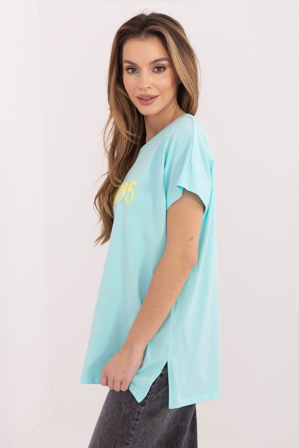 Élégant t-shirt femme dans un style décontracté, parfait pour les tenues de tous les jours. Ce modèle de longueur standard a un col rond classique et des manches courtes, ce qui assure confort et liberté de mouvement toute la journée. À l’avant, il y a une inscription en relief à la mode, qui est l’élément décoratif principal et donne au t-shirt un caractère moderne. Un autre avantage sont les petites fentes sur les côtés en bas, qui améliorent le confort de port et permettent au t-shirt de mieux s’ajuster à la silhouette. Le modèle est fabriqué en coton de haute qualité avec une touche d’élasthanne, ce qui rend le tissu doux, agréable au toucher et légèrement élastique. C’est une proposition polyvalente pour tous les jours, qui se marie parfaitement avec des jeans, des shorts ou des jupes.