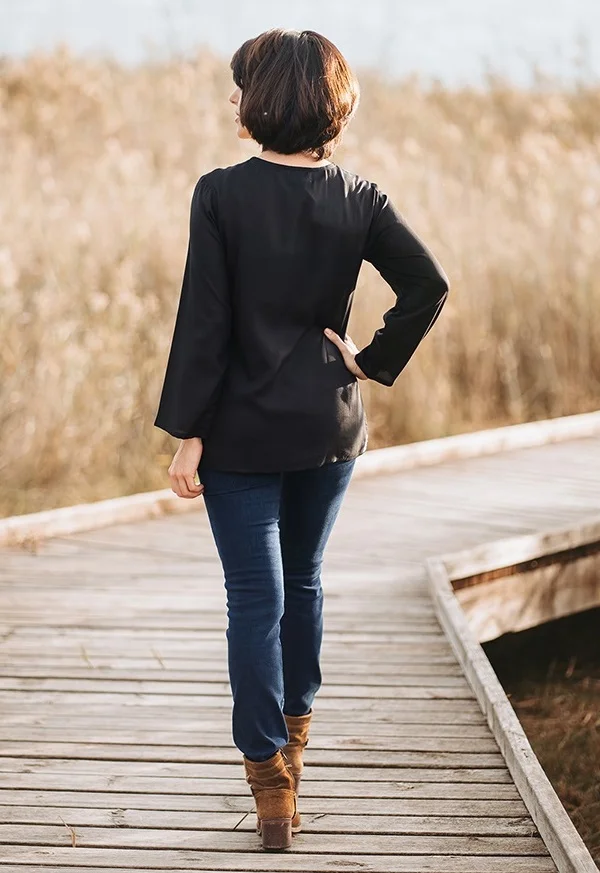 La blouse bohème chic est de couleur unique noire. Elle se porte plutôt ample. Choisissez votre taille habituelle, et au dessus si vous souhaitez la porter bien ample. Pour indication, le mannequin porte du S.