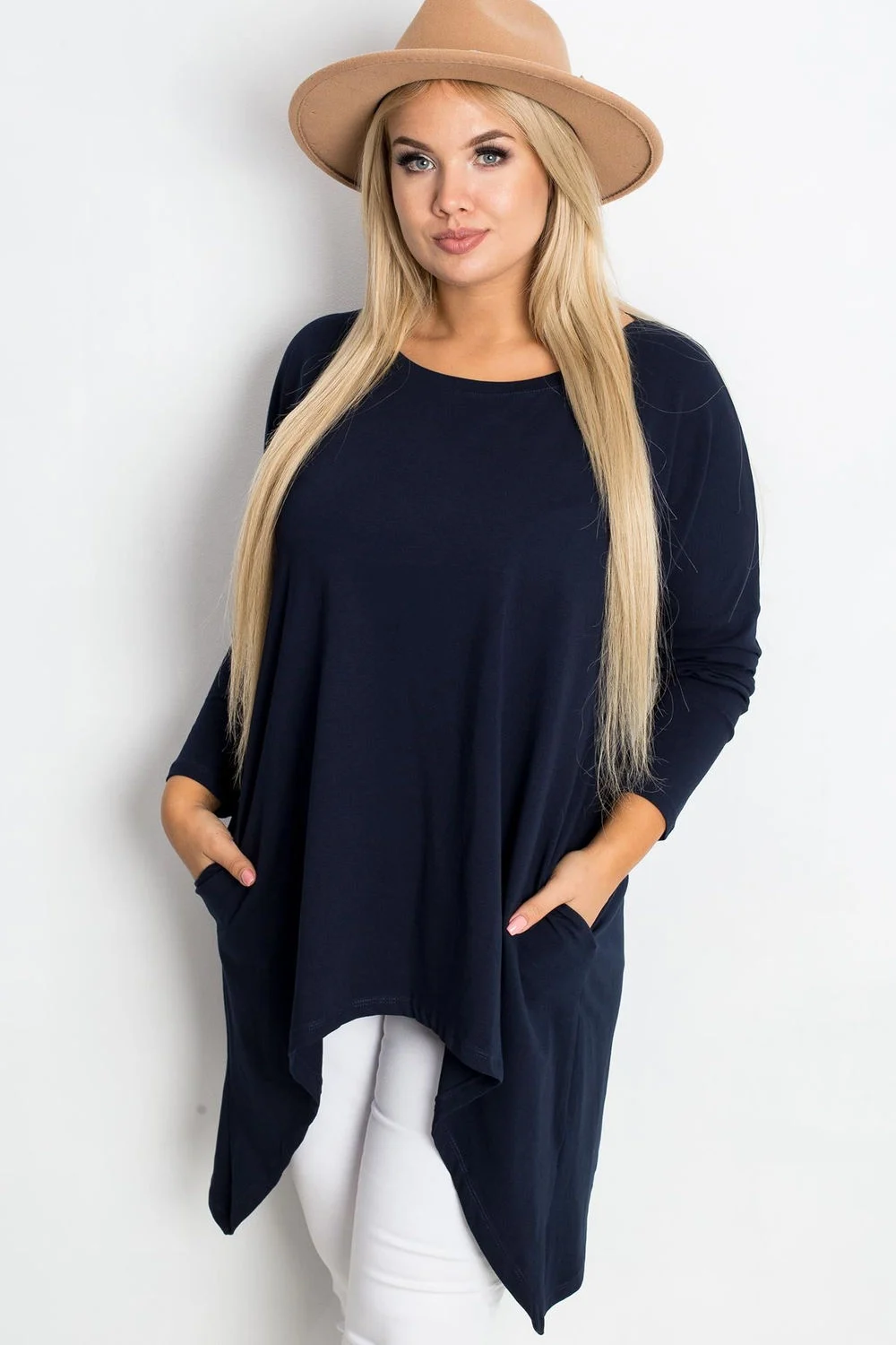 La chemise pour femmes de grande taille est une proposition confortable et élégante, parfaite pour les tenues décontractées au quotidien. Fabriquée en coton de haute qualité avec une touche d’élasthanne, elle est douce, élastique et agréable pour la peau, assurant ainsi un confort toute la journée. Le tissu lisse lui donne un caractère universel et permet de l’associer facilement à différents éléments de la garde-robe. Ce modèle se distingue par sa longueur et son ourlet asymétrique, qui affinent subtilement la silhouette et ajoutent une touche de style moderne. L’absence de fermeture souligne la coupe décontractée de la chemise, tandis que les poches pratiques dissimulées dans les coutures latérales augmentent sa fonctionnalité. C’est un choix parfait au quotidien pour le travail, une promenade ou une rencontre informelle, alliant confort et style à la mode.