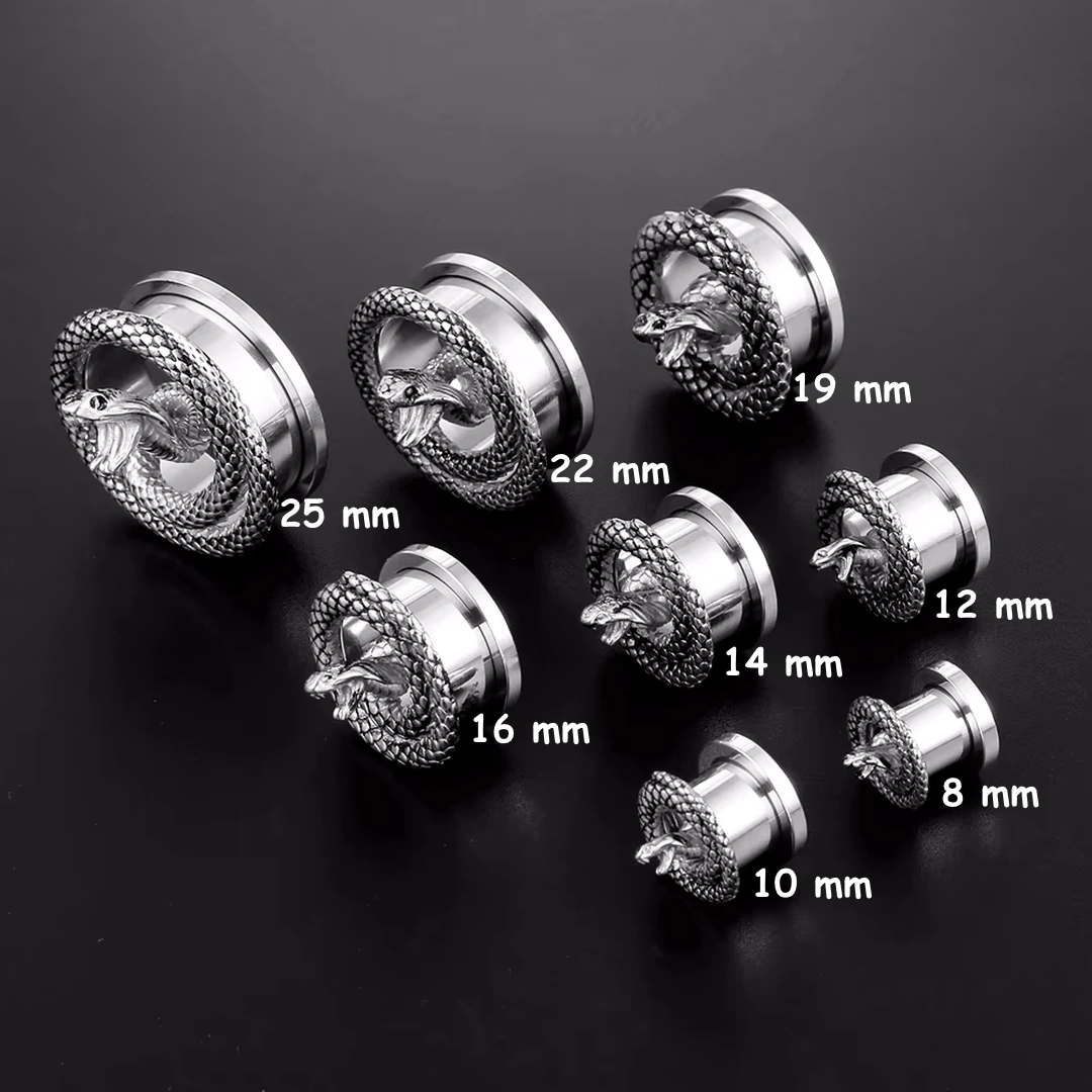 Écarteur tunnel oreille acier 316L, queue de cobra formant les bordures et tête rugissante au creux du lobe. Dévissable à filetage interne, diamètres 8-25 mm. Vendu à l’unité.
